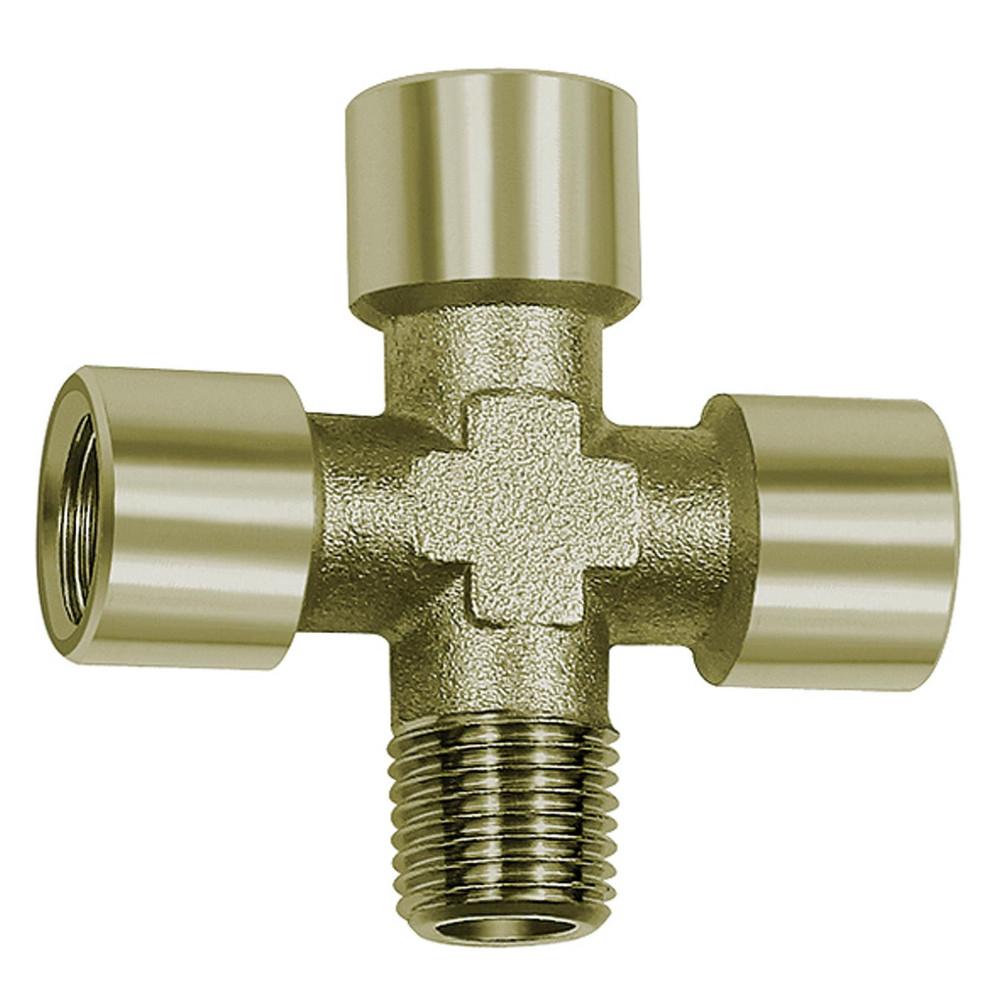 - Le raccord en croix est un raccord fileté en laiton nickelé avec trois filetages femelles et un filetage extérieur selon G/R.