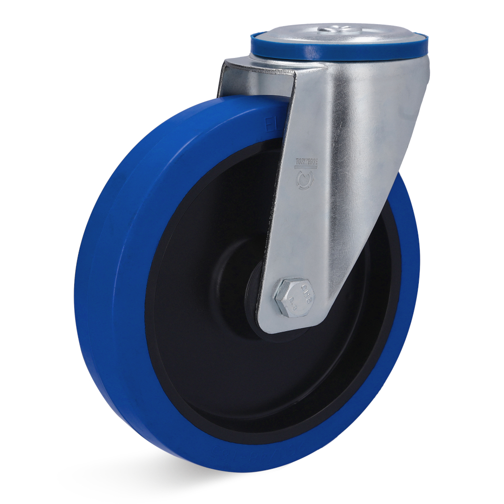 • Le corps de roue monté sur roulements est en plastique, la bande de roulement résistante à l'usure est en caoutchouc plein élastique bleu d'environ 65° Shore A.